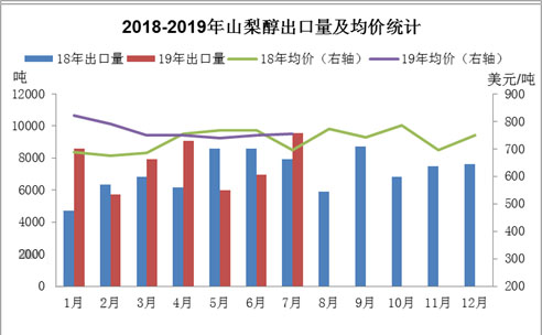 由上圖可以看出2019年7月份山梨醇出口量及出口均價較上月均有增加。據海關數據統計(29054400山梨醇)7月份出口量為9570.74噸,出口金額7216700美元,出口均價754.04美元/噸。2019年7月份出口量環比上月增幅37.25%,同比去年增幅20.62%,出口均價環比增幅0.41%,同比增幅8.42%。7月份山梨醇出口需求增加,或將一定程度緩解國內市場供應壓力,一定程度提振國內市場,所以在此利好推動下8月份山梨醇市場繼續延續偏強運行態勢。